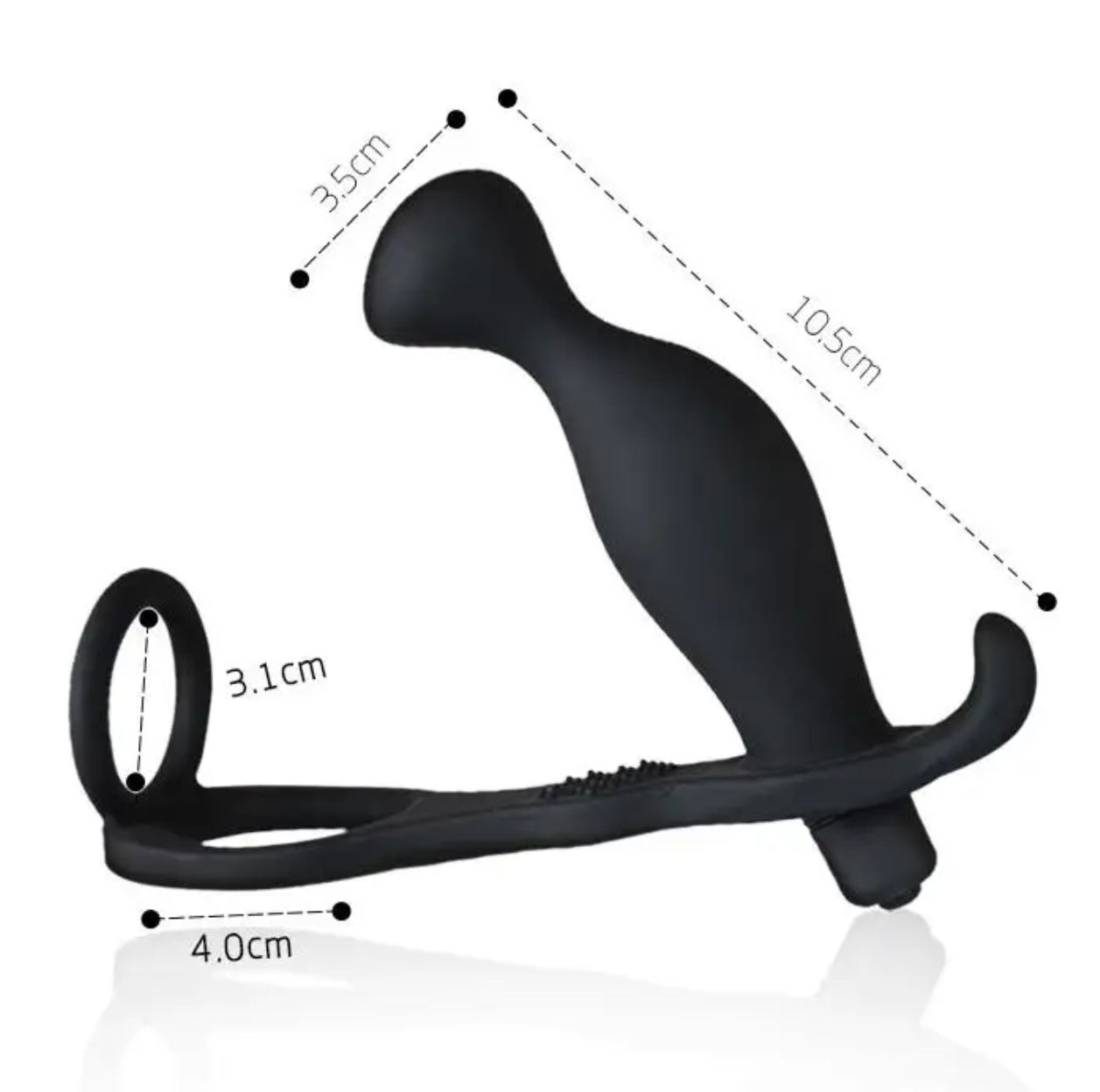 Enhance your pleasure with this Male Double Cock Ring with Vibrating Anal Plug. This all-in-one black silicone toy combines a comfortable dual cock ring (one for the penis, one for the scrotum) with a curved, thumb-shaped vibrating prostate plug for deep anal and perineum stimulation.