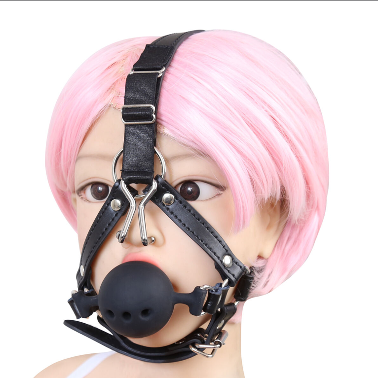 Silicone Ball Gag with Nose Hooks – Hollow Breathable Ball, Adjustable BDSM Head Harness