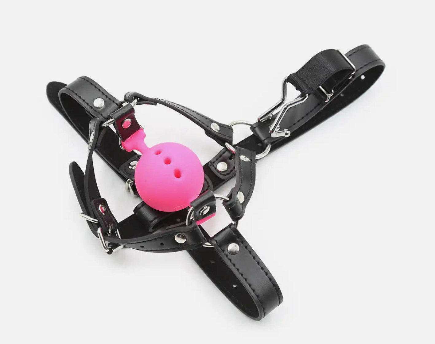 The hollow silicone ball (with ventilation holes) sits comfortably in the mouth while allowing limited airflow, reducing the intensity of traditional solid balls and making it more suitable for longer sessions. The sturdy black head harness includes adjustable straps with metal buckles and D-rings for a secure, customizable fit. The nose hooks add an extra layer of control, gently lifting and restricting nose movement to heighten the sense of helplessness.