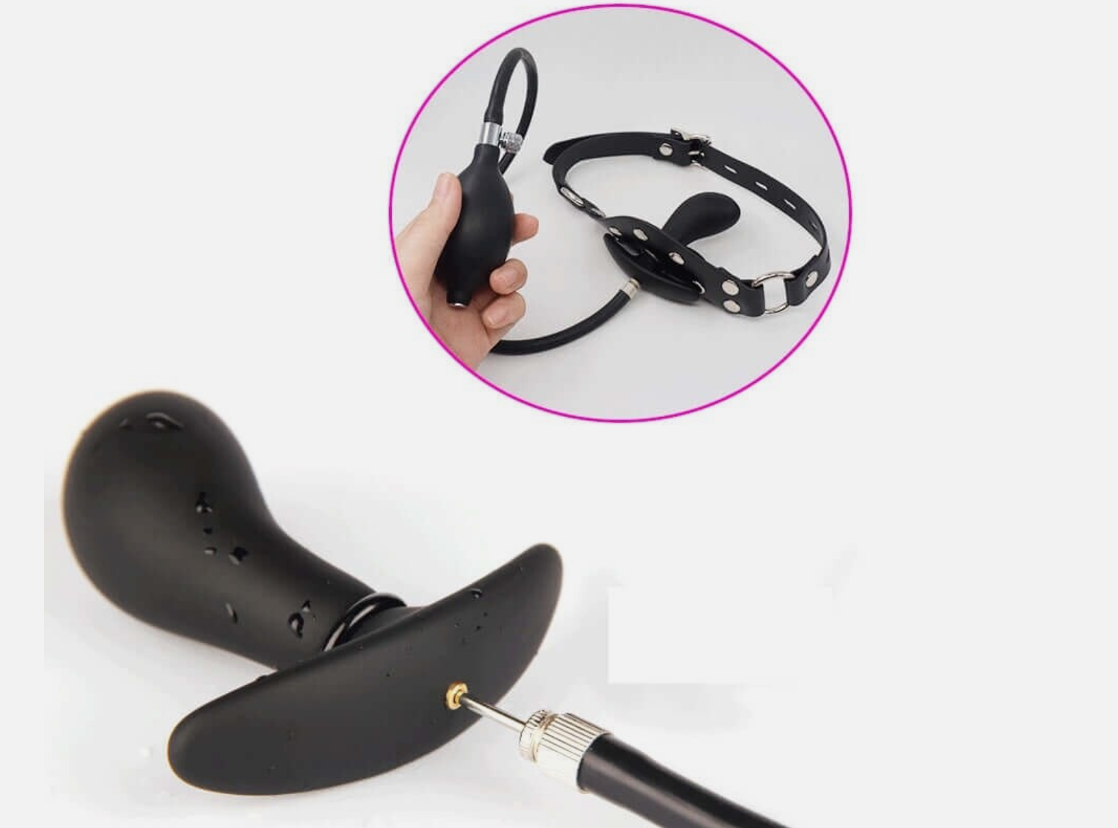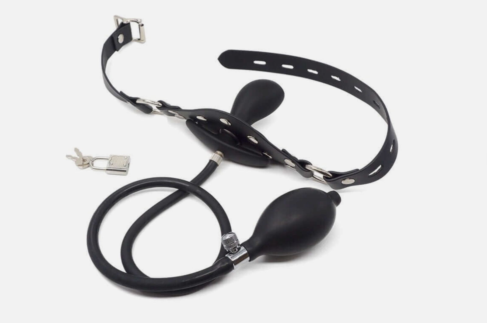 Safety Note: Always use with clear consent and a non-verbal safe signal. Never leave a gagged or inflated-gag wearer unattended. Start with minimal inflation and short sessions. Monitor breathing and comfort at all times. Deflate fully before removal.