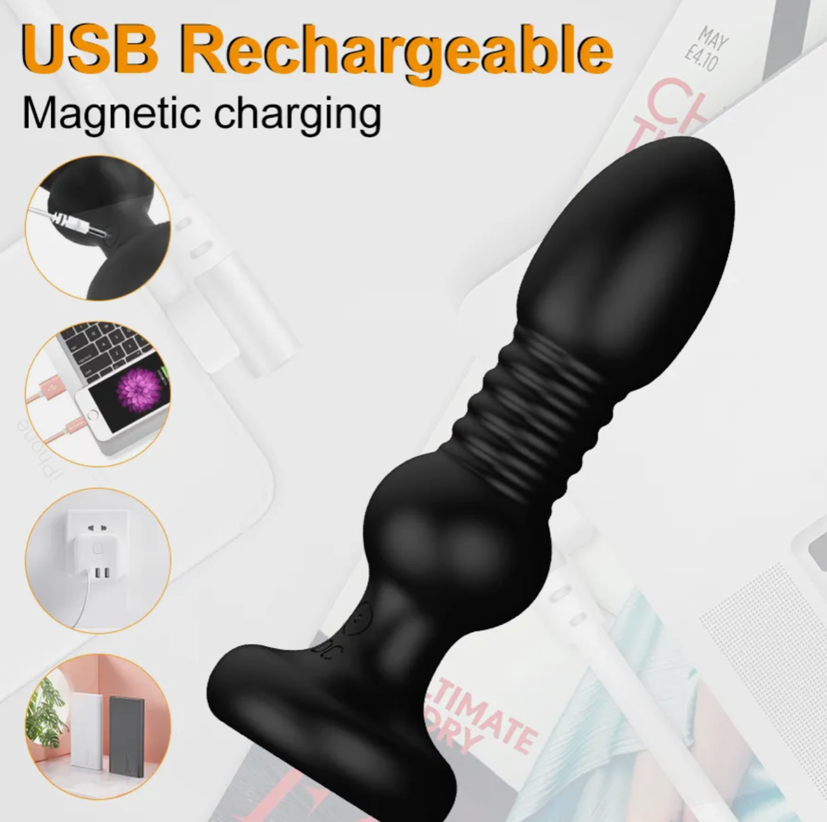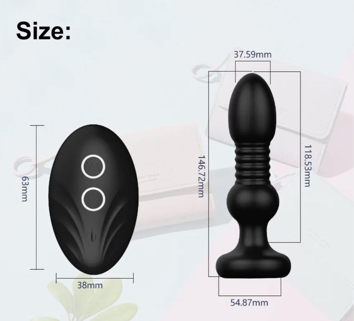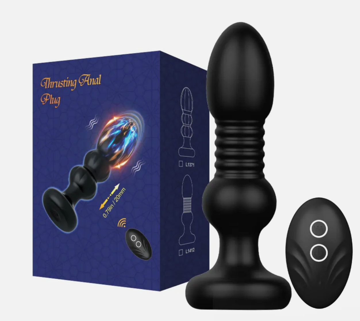 Intensify your anal and prostate pleasure with this Thrusting Anal Plug with Remote. This sleek black toy combines powerful 3-speed thrusting motion with a ribbed, beaded shaft for deep, rhythmic stimulation that mimics realistic movement.